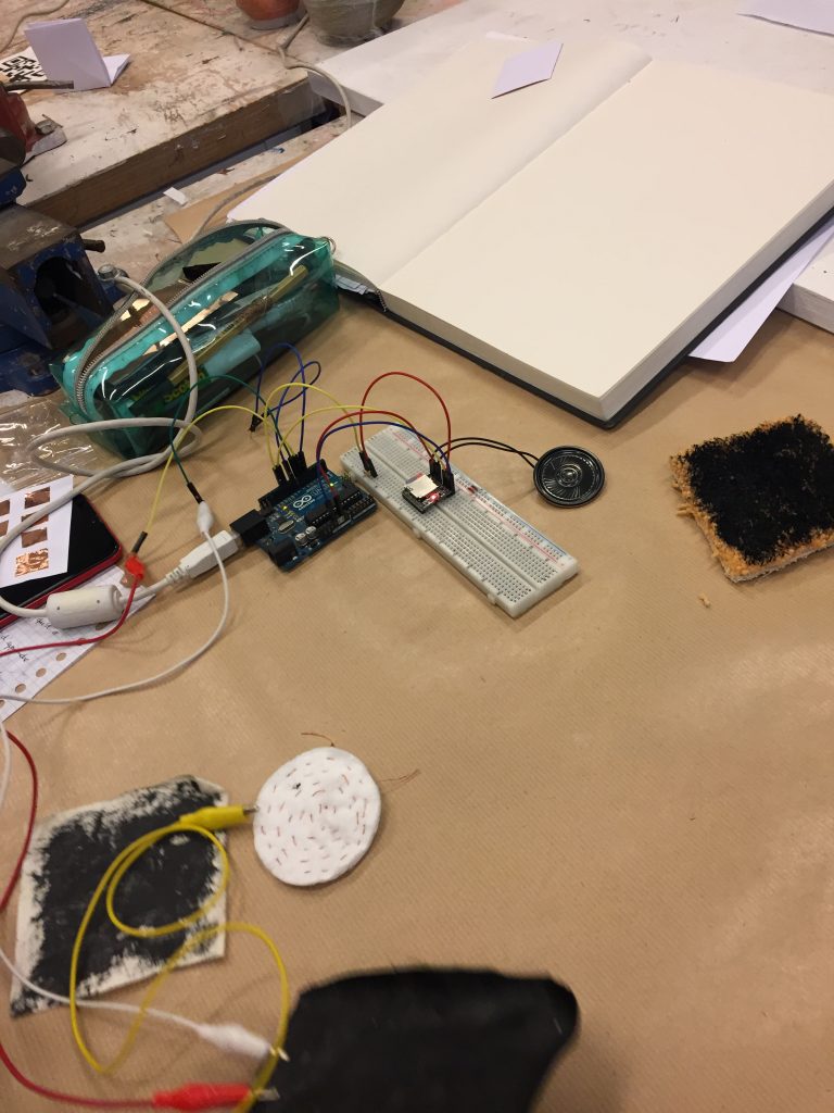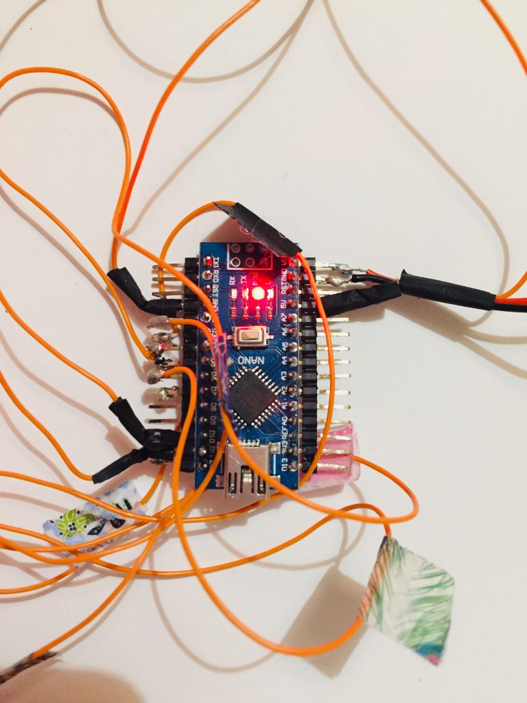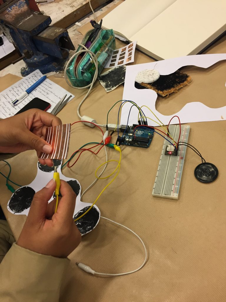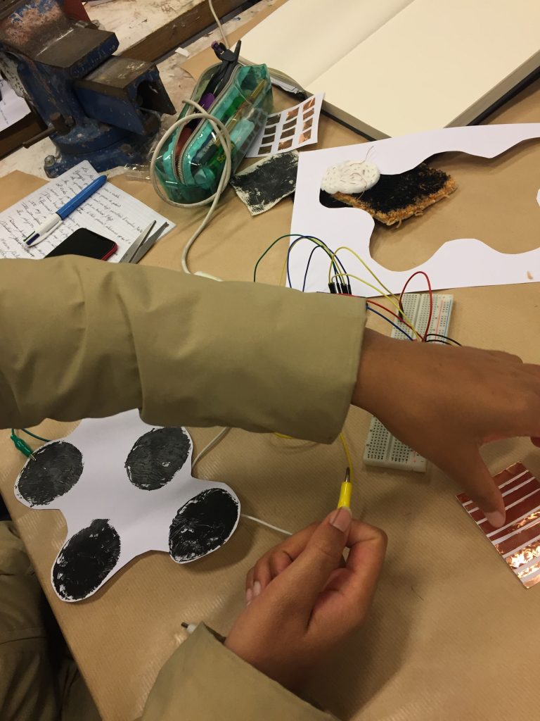 Durant le workshop nous avons pu nous familiariser avec l’électronique et plus particulièrement avec le système Arduino. Le but final est de pouvoir combiner cette technologie avec du textile (broderie, tricotin …) ou bien du papier (teinture, sérigraphie …).