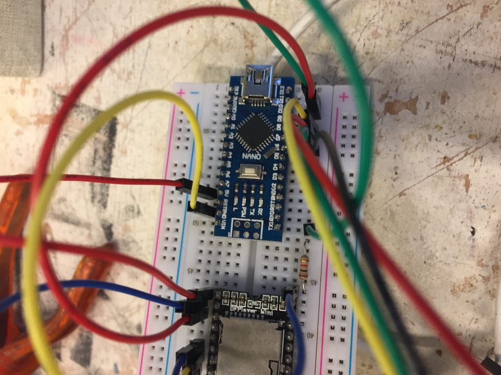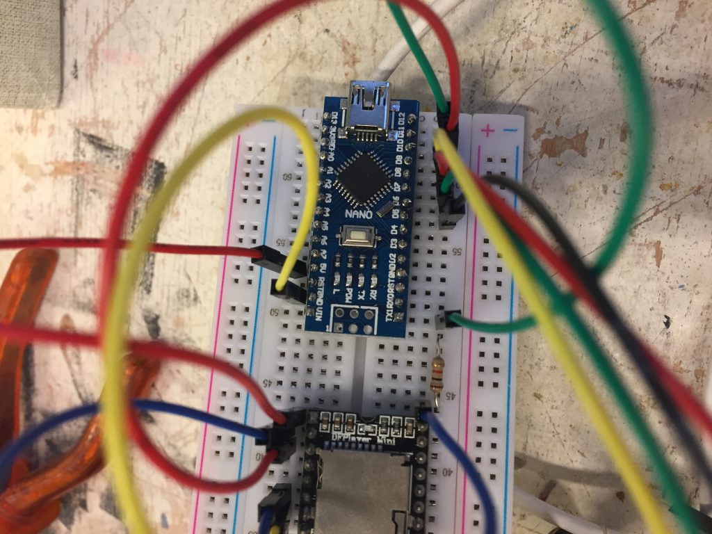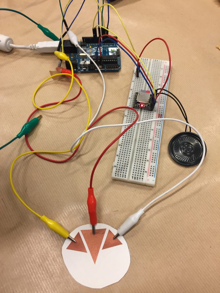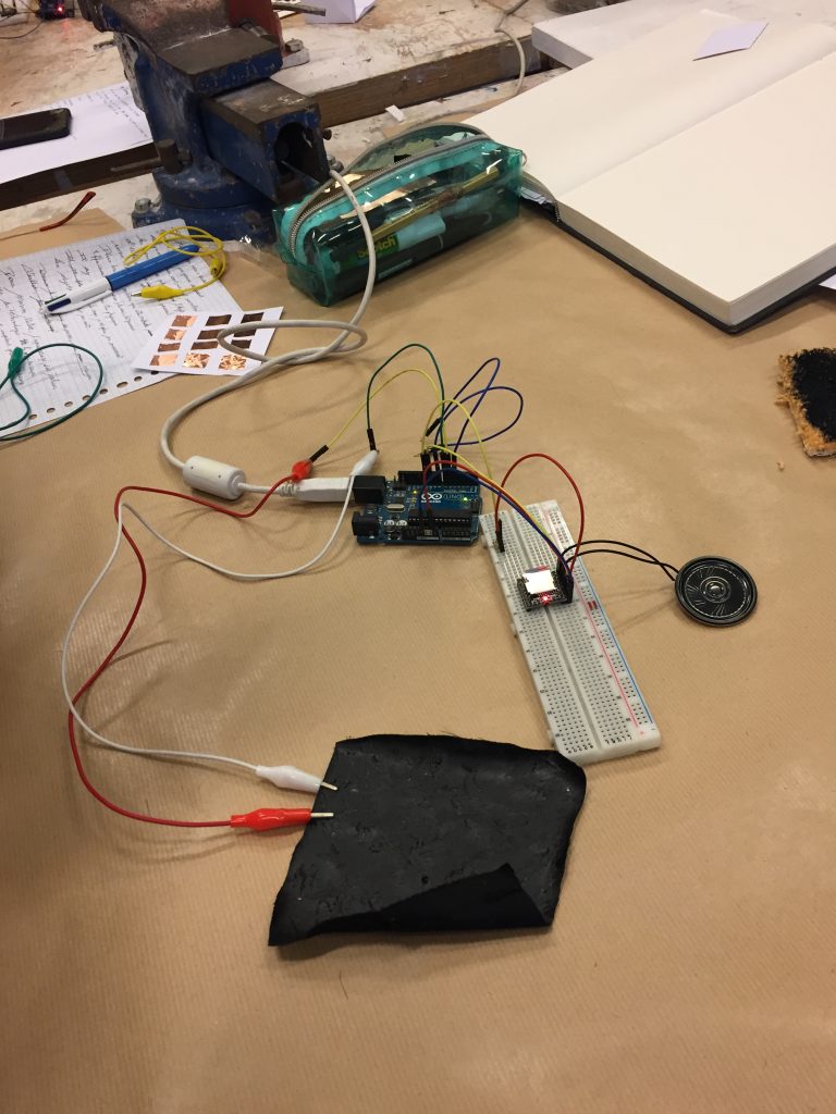 Durant le workshop nous avons pu nous familiariser avec l’électronique et plus particulièrement avec le système Arduino. Le but final est de pouvoir combiner cette technologie avec du textile (broderie, tricotin …) ou bien du papier (teinture, sérigraphie …).