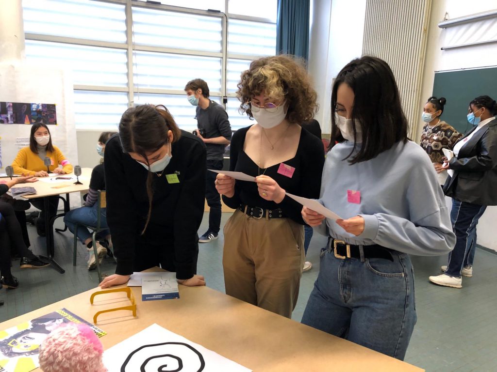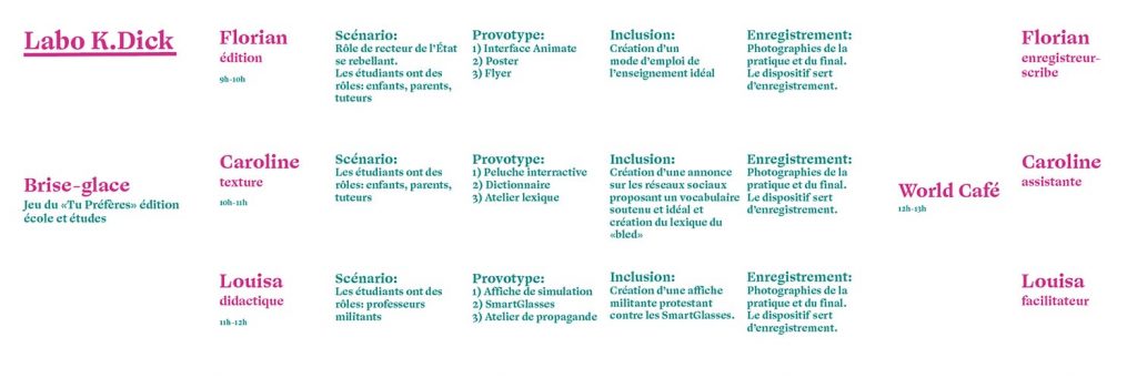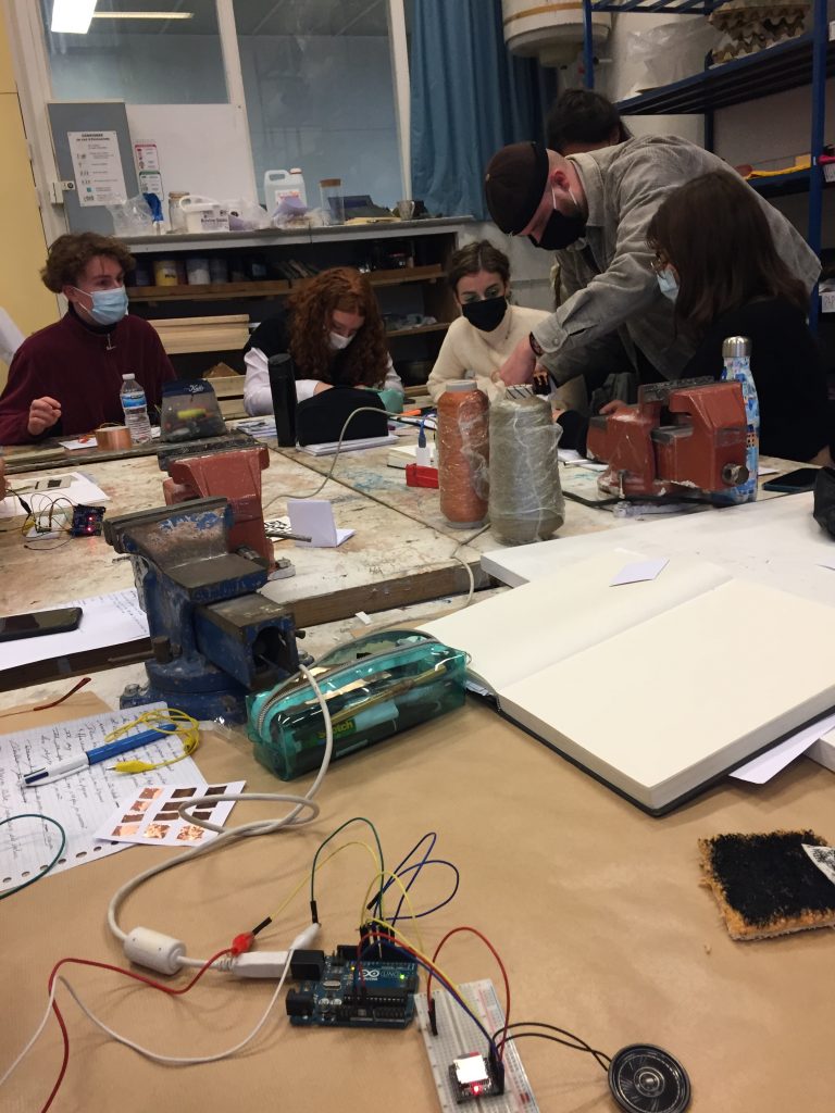 Pour conclure, je dirai que mon atelier c’est déroulé comme prévu, les étudiantes ont trouvées des solutions auquels je n’avais pas pensé. Lors d’un prochain atelier, je pense que j’essaierai de diriger les questions durant la phase de débat, car tout le monde n’a pas eu son temps de parole et le temps fût trop court et mal distribué. Nous avons terminé le débat trop tôt et j’ai dû trouver de nouvelles alternatives pour faire rebondir les étudiantes sur d’autres questionnements qui concerne le langage en particulier. Enfin, mon provotype ne fonctionnant pas, j’ai dû me rabattre sur une écoute des sons via un ordinateur, ce qui provoqua moins de surprise et de questionnements.