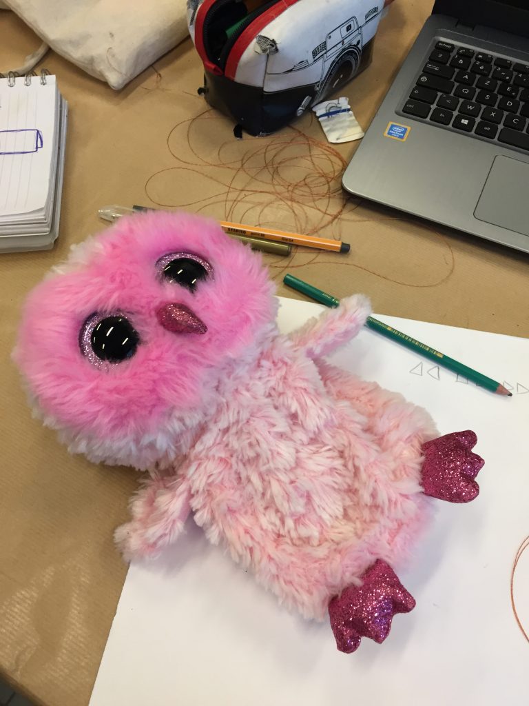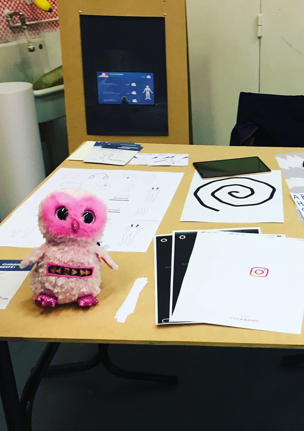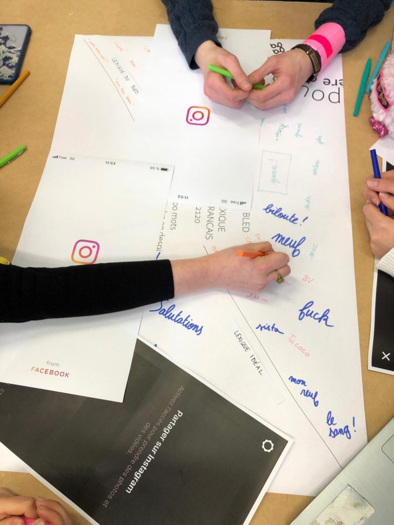J’ai commencé la présentation de mon atelier par une introduction en expliquant l’univers de mon scénario et la création de mon provotype. Quel langue parlerons nous en 2120 ? C’est la question que j’ai posé aux étudiantes. Je suis parti du principe qu’en 2120, la langue française sera celle parlée par les jeunes d’ajourd’hui. En effet mon scénario repose sur le faite que ce sont les jeunes qui font évoluer le langage au fil des siècles. Ainsi, à l’école, dans la rue, au travail, dans des lieux académiques, entre amis ou en famille, la langue parlée sera fait de mots simples et vulgarisées. Pour se faire, mon atelier commença avec la réalisation d’une carte mentale pour tenter de trouver un maximum de mots et expressions dans le but de créer le lexique du dictionnaire du futur appelé : Le Bled. Les étudiantes ont ainsi pu réfléchir à leur propre langage du quotidien. Ensuite, ayant pour thème : Recherche crèche design, j’ai choisi le support de la peluce intéractive pour illustré mon scénario. Mon provotype est donc une peluche pour enfants du futur qui parle la langue du futur. Sous le ton de l’humour et du décalage, cette peluche suscita beaucoup de curiosité sur l’impact d’apprendre un tel langage à des enfants en bas âge. Les conséquences sont un appauvrissement du langage français et une perte de la culture française. La cause de ce phénomène sont, dans mon scénario, les réseaux sociaux. Voulant toujours aller plus vite, le langage c’est peu à peu modifié au fil des siècles.
