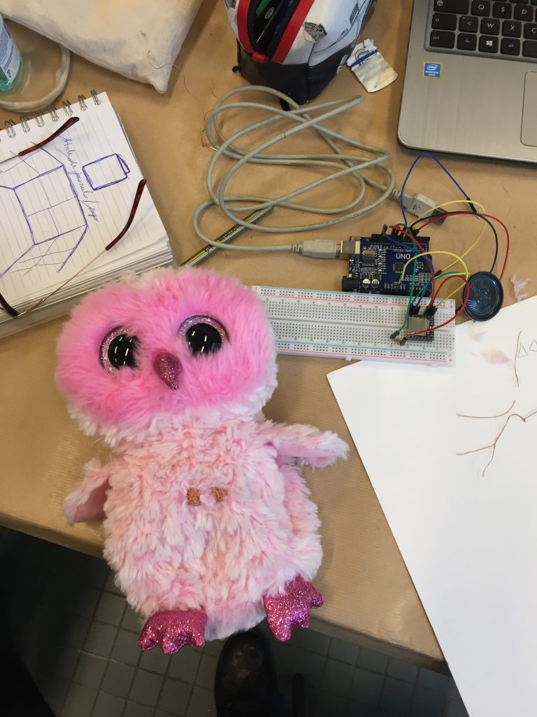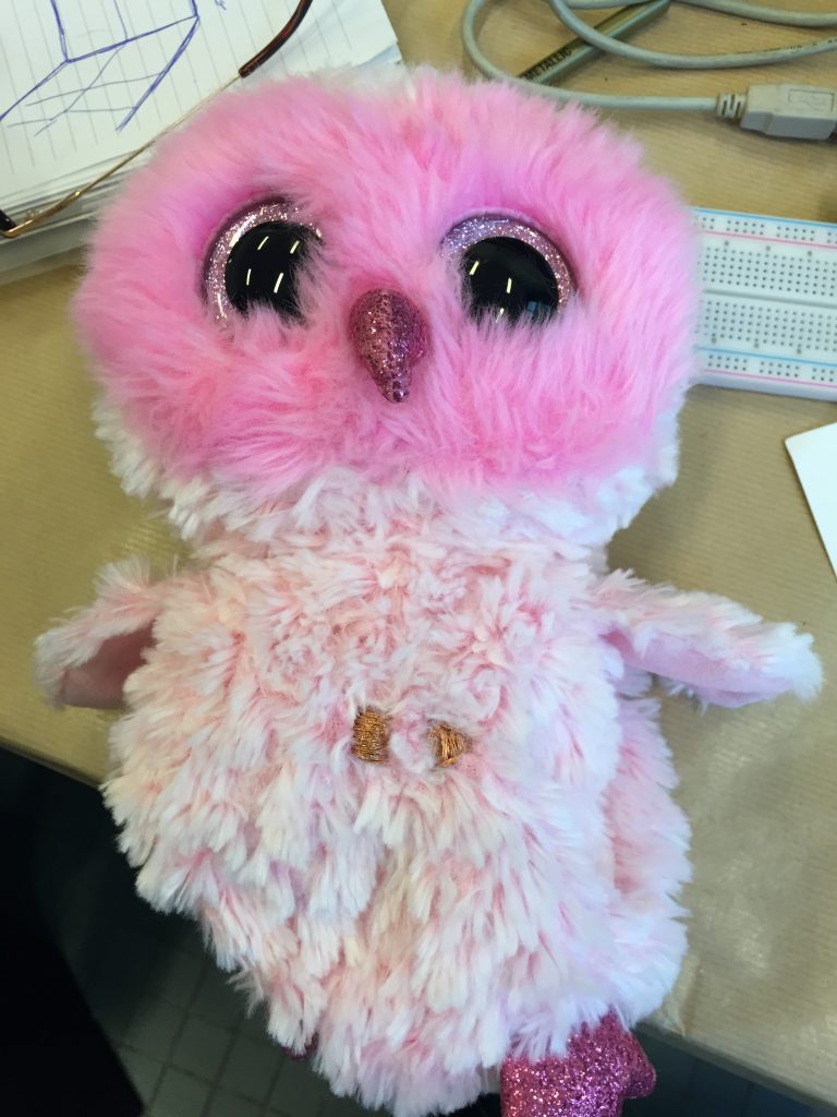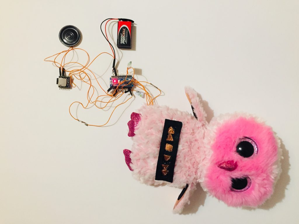 Le circuit de la peluche est constitué de six boutons. Sur son ventre on a un bouton play, un bouton stop, un bouton musique précédente et un bouton musique suivante. Sur chacune des ailes, il y a du tissu conducteur ce qui ajoute alors deux boutons supplémentaires. Ce sont des surfaces qui permettent de produire un son lorsque l’on touche le tissu.