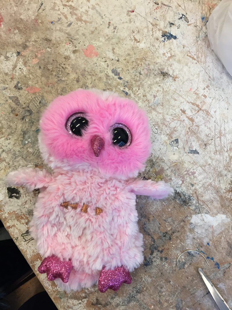 J’ai choisi une peluche aux couleurs saturées pour vraiment être dans un univers dystopique face à la réalité, la peluche archétypale des enfants d’aujourd’hui par excellence, l’animal qui n’en est plus un, les couleurs et les formes qui sont poussés jusqu’au bout, un peu comme pour les humains avec le transhumanisme, ici c’est l’animal qui devient totalement méconaissable.