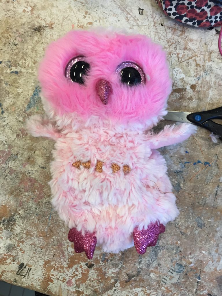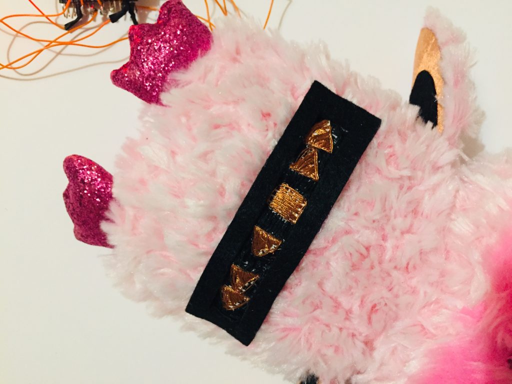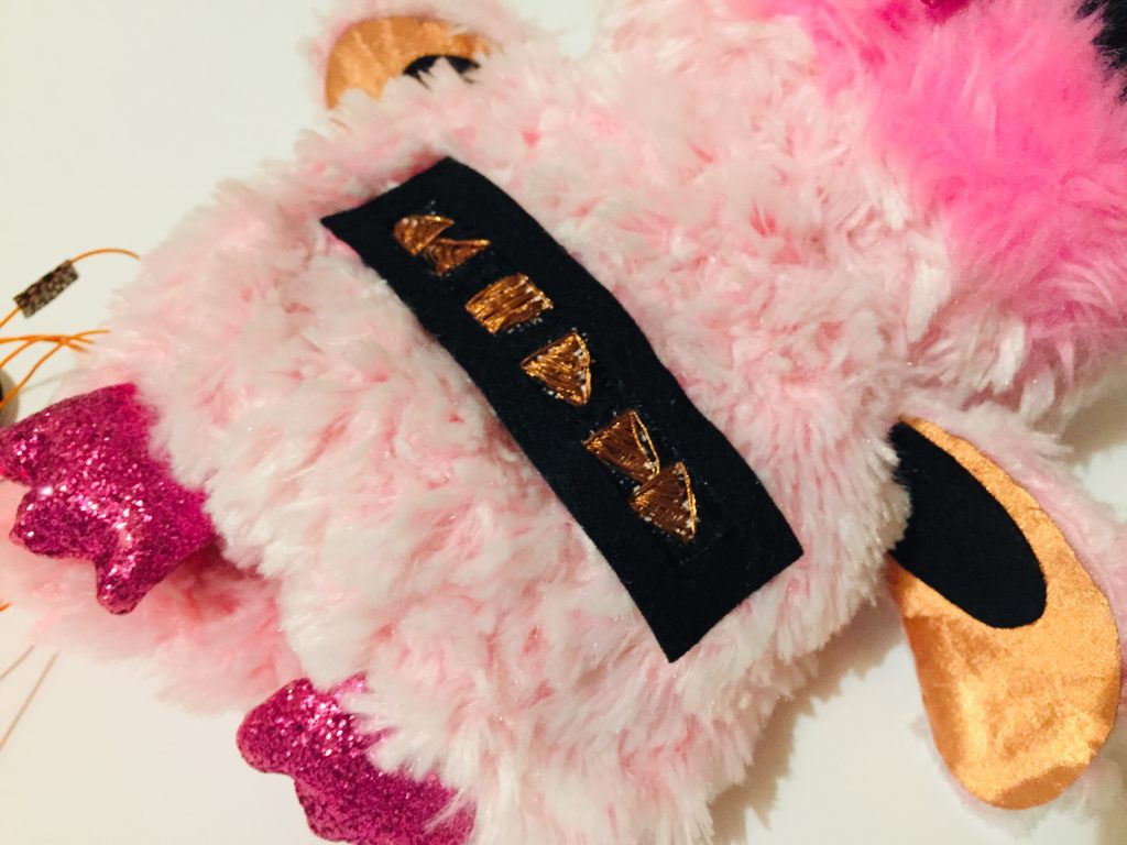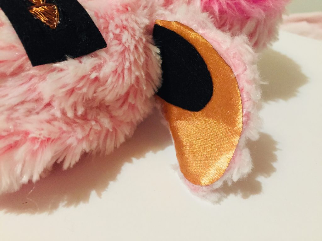 J’ai également choisi de mettre de la feutrine rose autour de ces boutons pour qu’ils soient plus intégrés dans la peluche.