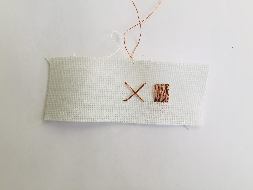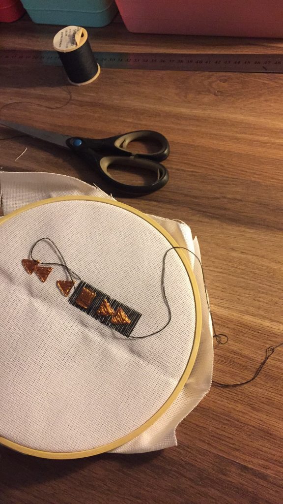 C’est alors que j’ai décidé de broder les boutons play, stop, précédent et suivant avec du fil de cuivre sur un tambour pour pouvoir ensuite les coudres sur le ventre de la peluche. Cela me permet d’avoir un rendu plus précis et fini.