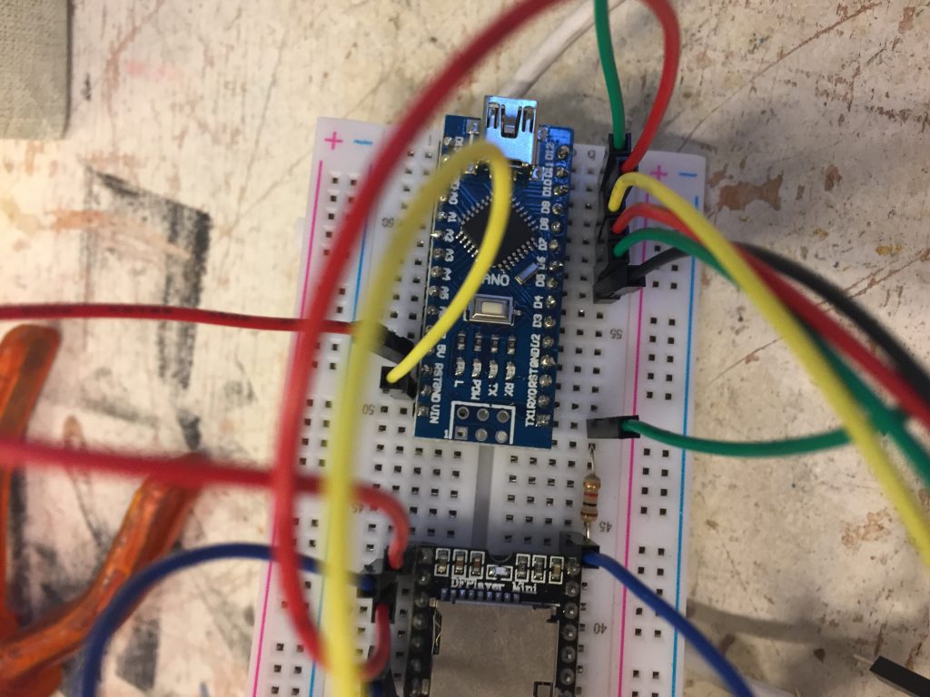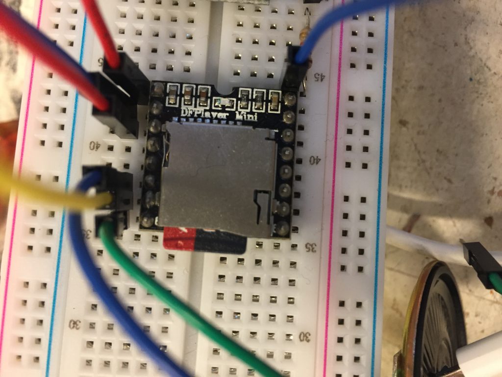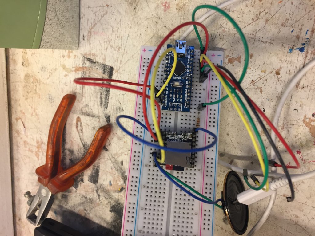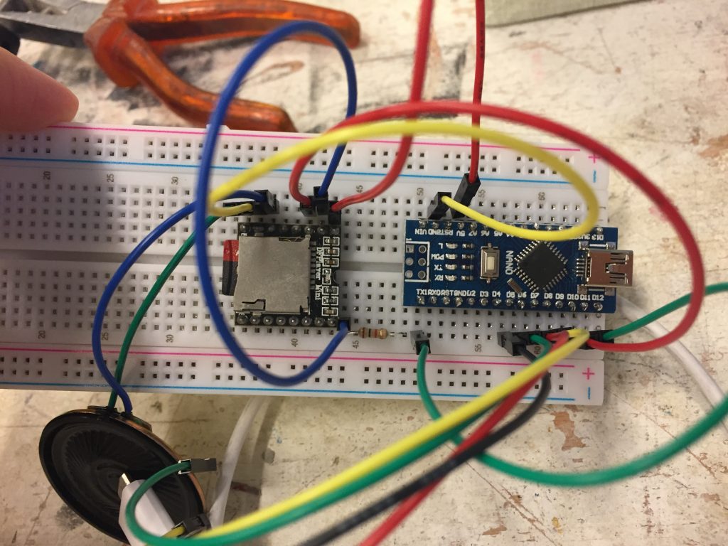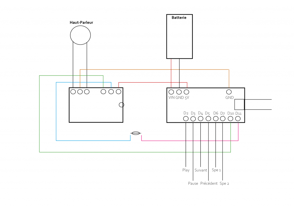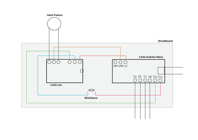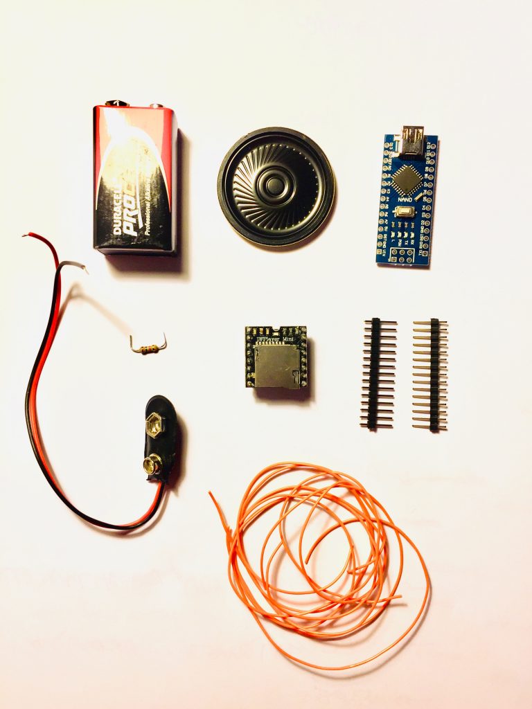 Les composants du circuit sont : Une batterie de 9V, un haut-parleur, une carte arduino nano, une résistance, une carte son mp3, un cable pour connecter la batterie, six cables, deux barettes de piques à souder à la carte arduino nano.