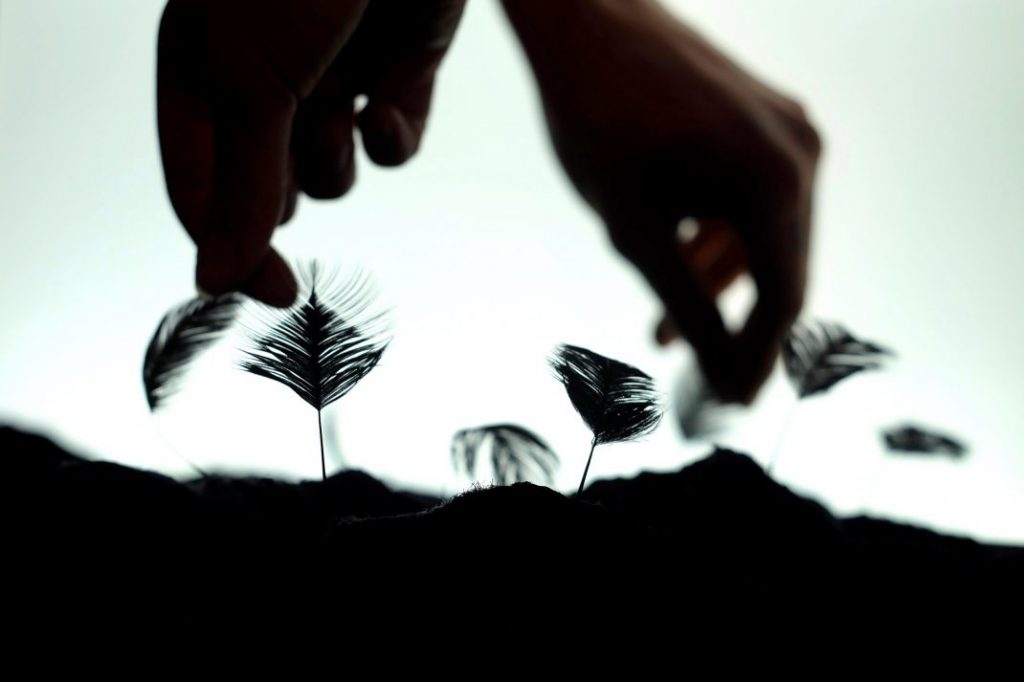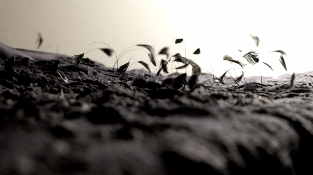 Le projet sur les oiseaux stymphaliens repose sur une installation à base de plumaserie et d’électronique. Les oiseaux stymphaliens sont, dans la mythologie grecque, des animaux de compagnies mangeurs d’humains d’Artémis qui ont des plumes métalliques. Cette composition est une installation artistique qui allie la technologie numérique (ce que l’on rattache à l’époque moderne) à la haute couture (ce qui fait écho au savoir faire et à la tradition). Ce textile offre une expérience multi-sensorielle de part les différents sens qui y sont convoqués, le touché, la vue et l’ouïe.