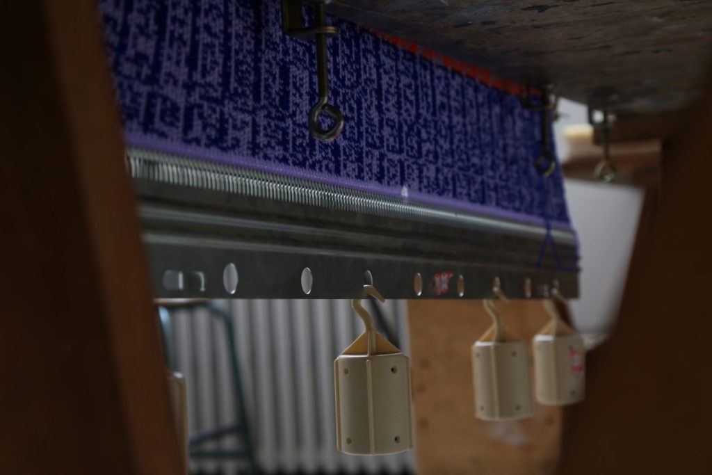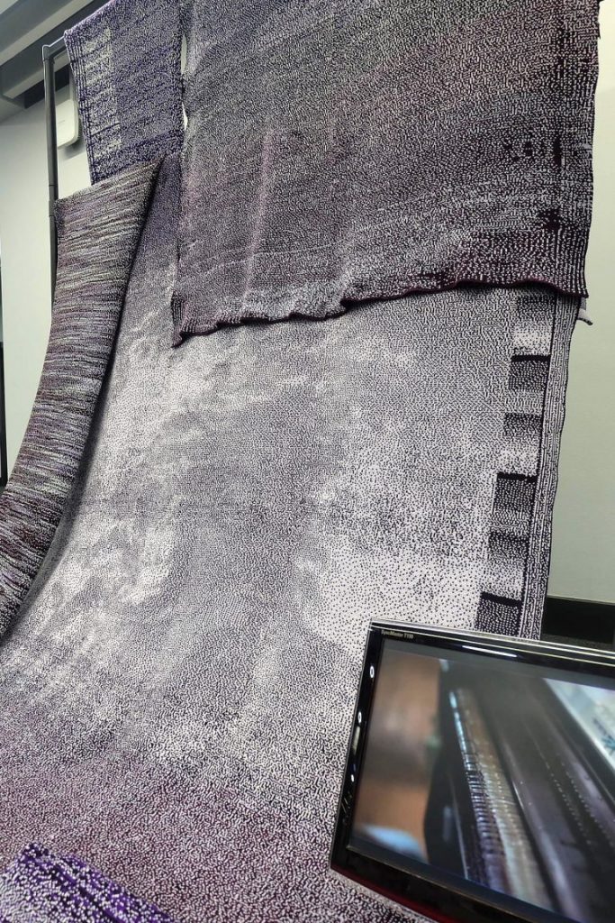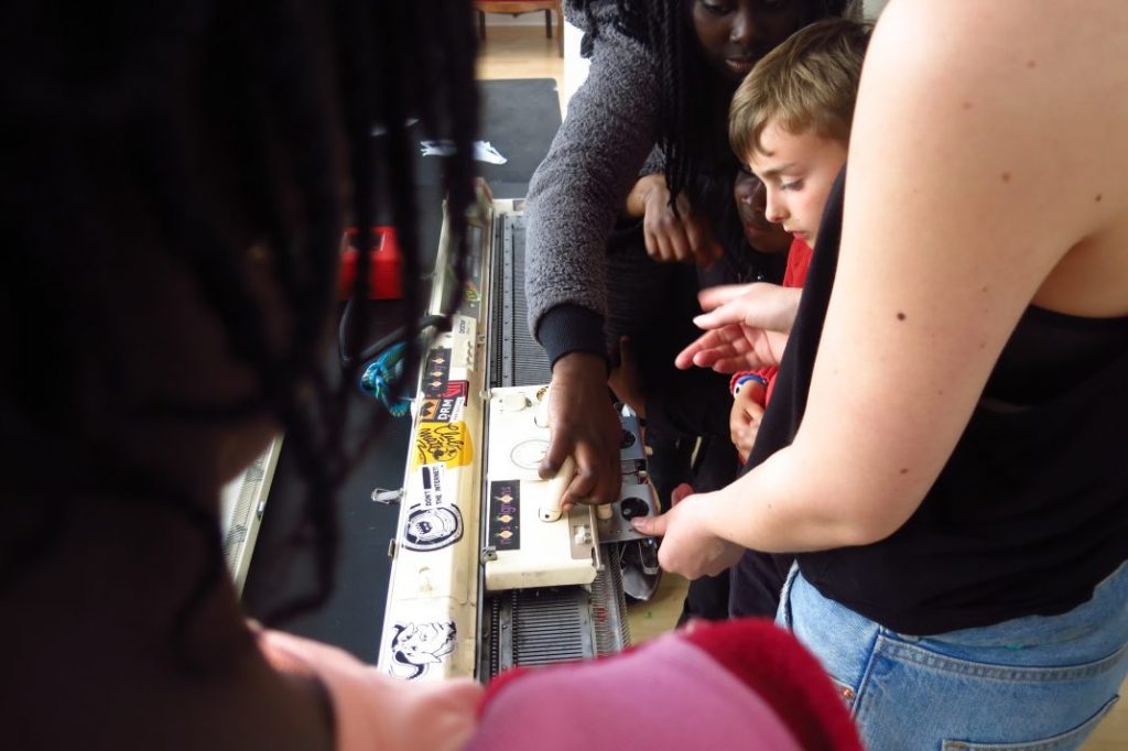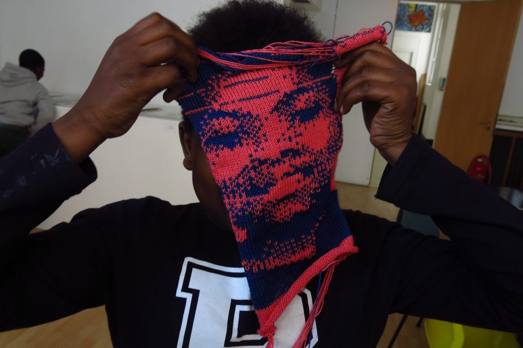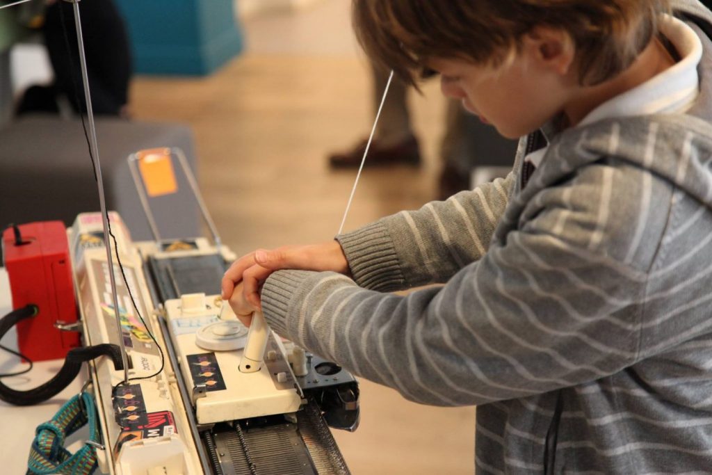 Cet atelier met en évidence les liens entre les technologies informatiques et le tricot. Les enfants ou adultes ont pu tricoter, à partir d’une photographie, leur visage avec les couleurs qu’ils souhaitaient. Ils ont figé un instant, c’est une expression qui est gelé dans le temps. On peut voir cet atelier comme un projet de design social qui fait intervenir des enfants dans la réalisation d’un tricot, ce qui leur fait découvrir une technique, un certain savoir faire.