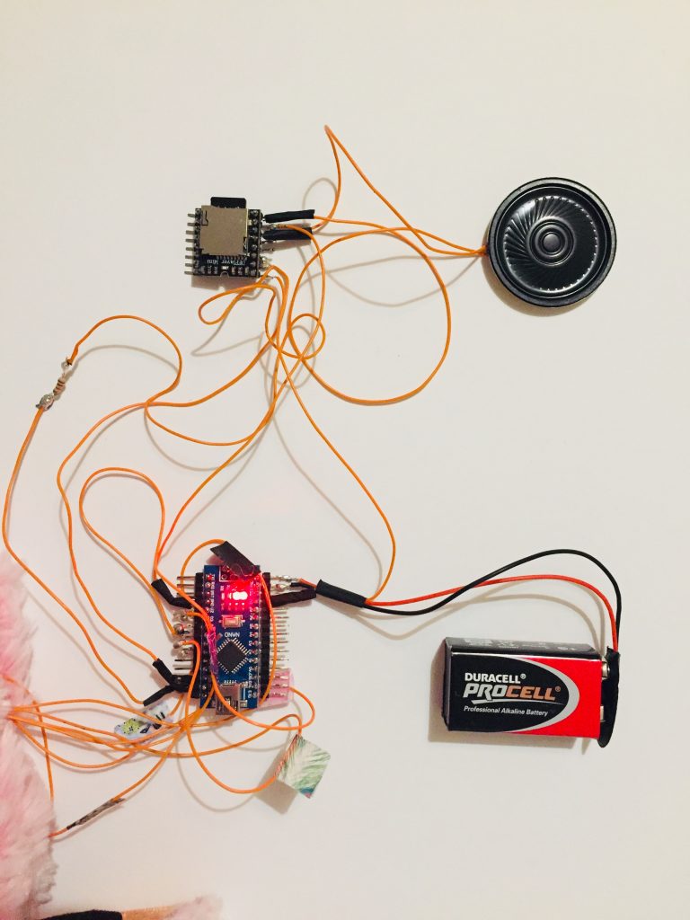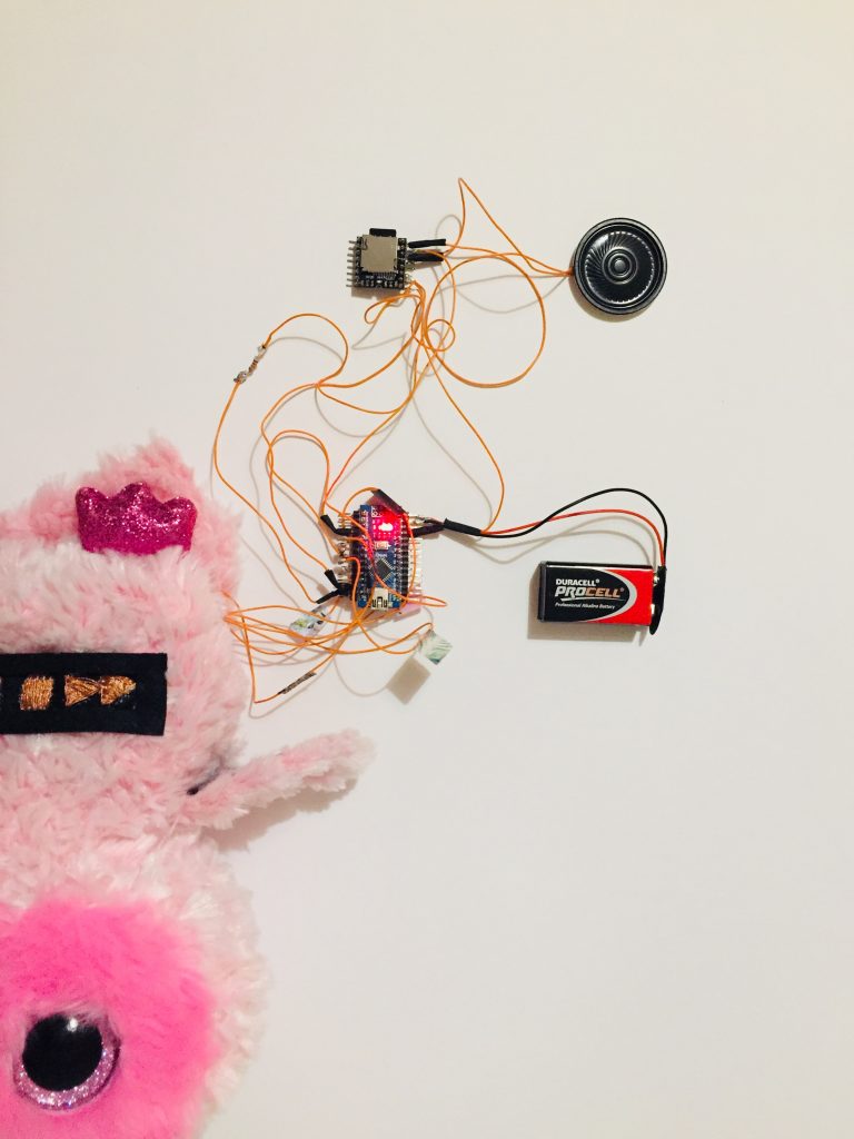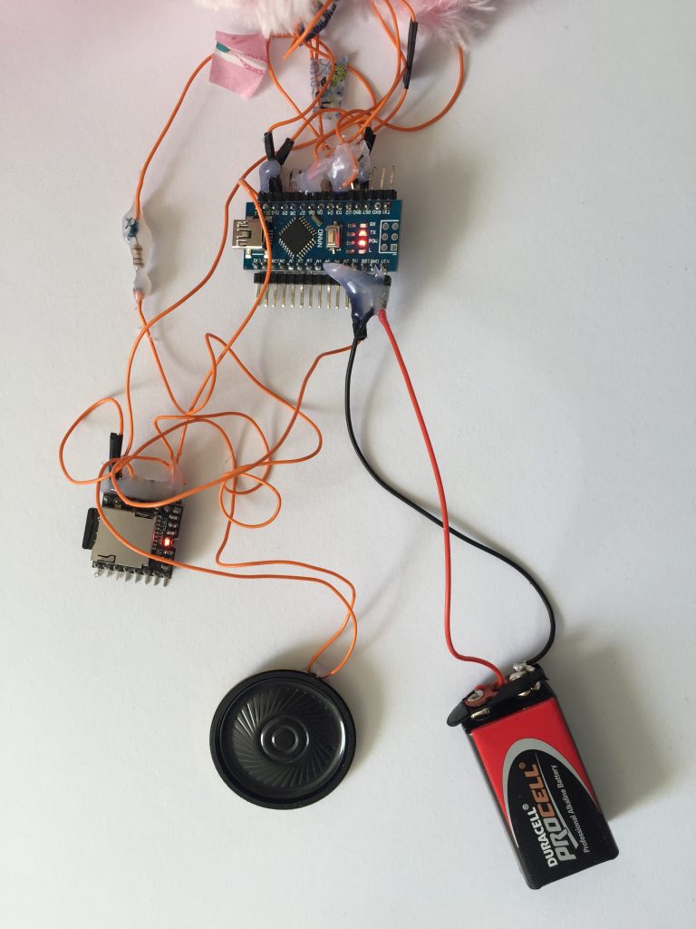 Le circuit électronique a été réalisé sans breadboard pour pouvoir le placer dans la peluche et pouvoir la tenir en main et la transporter où l’on souhaite. Elle n’est pas branché et fonctionne avec une pile 9V. Une partie de la mousse de l’intérieur de la peluche a été extraite pour pouvoir placer le circuit. Le haut parleur a été placé bien vers l’avant pour pouvoir au maximum faire diffuser au mieux le son.