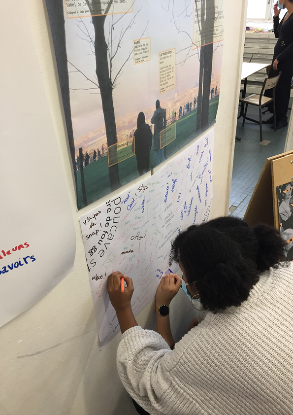 Par la suite, les étudiantes ont du réaliser une liste d’annonce possible sur les réseaux sociaux pour contrer cette appauvrissement du langage. Comment réussir à garder la richesse de la langue française ? Quels moyens pouvont nous utiliser sur les réseaux sociaux ? Les idées ont été les suivantes : Un QCM sur l’orthographe des mots ou sur les synonymes, un quizz avec des questions sur la définition d’un mot par exemple, un hashtag avec : lacheunmot (lache un mot), des concours de celui qui utilise le meilleur ancien mot … Après avoir débriefé sur ses idées de solutions, nous avons affichés le lexique du Bled et les annonces des réseaux sociaux sur le mur puis nous avons débattu autour des effets négatifs et positifs d’un tel langage s’il est amené à être parlé couramment.
