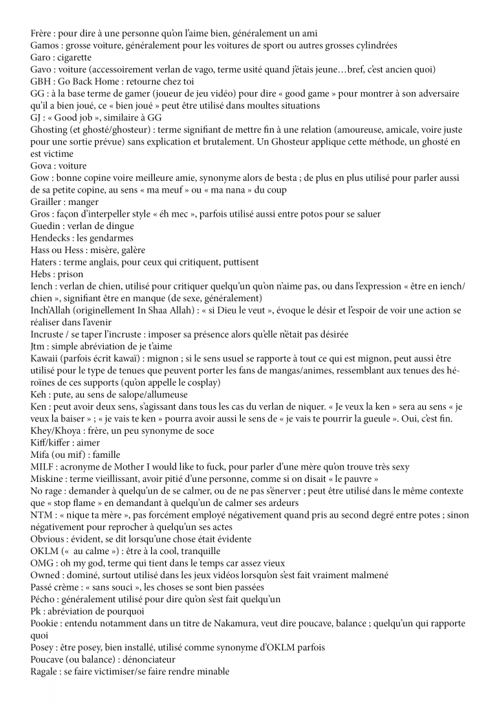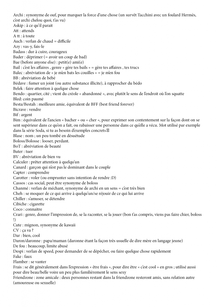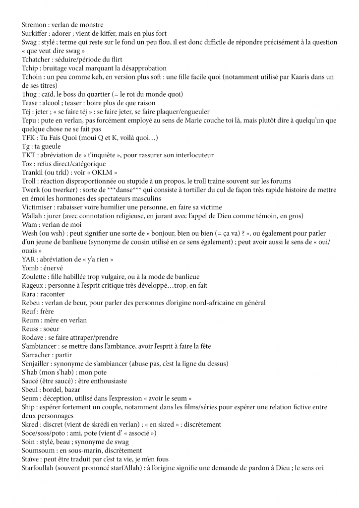 Les mots simples, la vulgarisation du langage et le verlan seront les piliers de cette nouvelle langue du futur. Le verlan est une forme d’argot français qui consiste en l’inversion des syllabes d’un mot et un argot est un langage ou vocabulaire particulier qui se crée à l’intérieur de groupes sociaux ou socio-professionnels déterminés et par lequel l’individu affiche son appartenance au groupe et se distingue de la masse des sujets parlants.