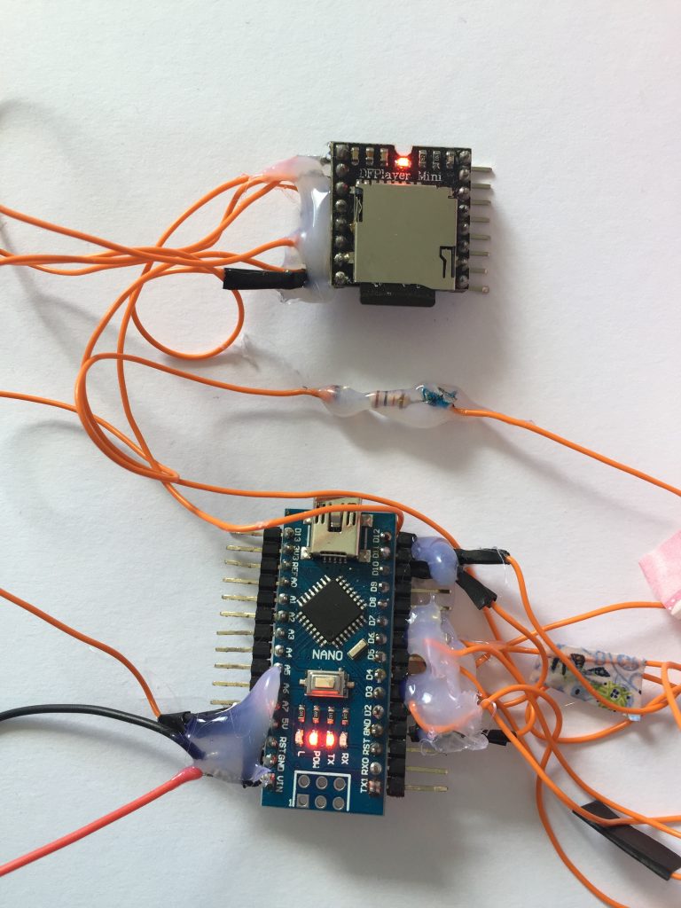 Par la suite, j’ai décidé de mettre de la colle chaude tout autour des pins pour ne pas qu’ils se désoudent ou qu’ils ne se cassent lors de l’insertion du circuit dans la peluche. Ainsi par exemple un enfant peut prendre la peluche et la bouger dans tous les sens sans casser le circuit interne.