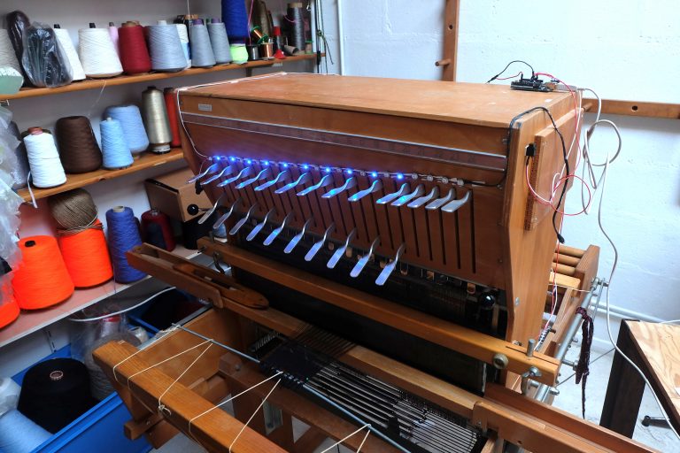 C’est un métier à tisser trafiqué et informatisé grâce à une carte arduino et des led. Comme pour le collectif Pixtil, le but est d’améliorer et d’innover un outil traditionnel afin de créer des motifs complexes et infinis.