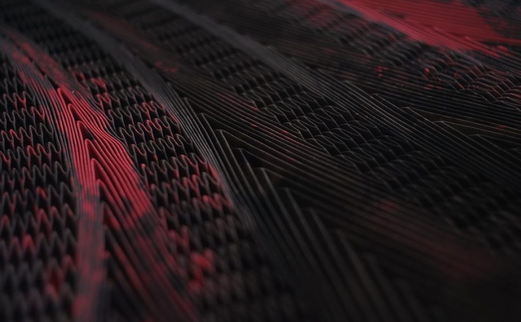 C’est une installation interactive en textile augmenté qui offre une expérience multisensorielle. Lorsque la main est au contact avec ce tissu, un paysage futuriste et abstrait se crée sur un écran. Le collectif a collaboré avec la Maison Lognon, spécialiste du plissage, afin de créer un textile plissé et électrique. Avec des outils rudimentaires, le tissu plissé est réalisé à partir d’un procédé de polymérisation. Le motif noir et rouge est inspiré de la technique du Shibori qui repose sur un principe de ligature. Les formes en rouge représentent les parties ligaturées. Les éléments en noir sont conductibles qui permettent de créer des intéractions.