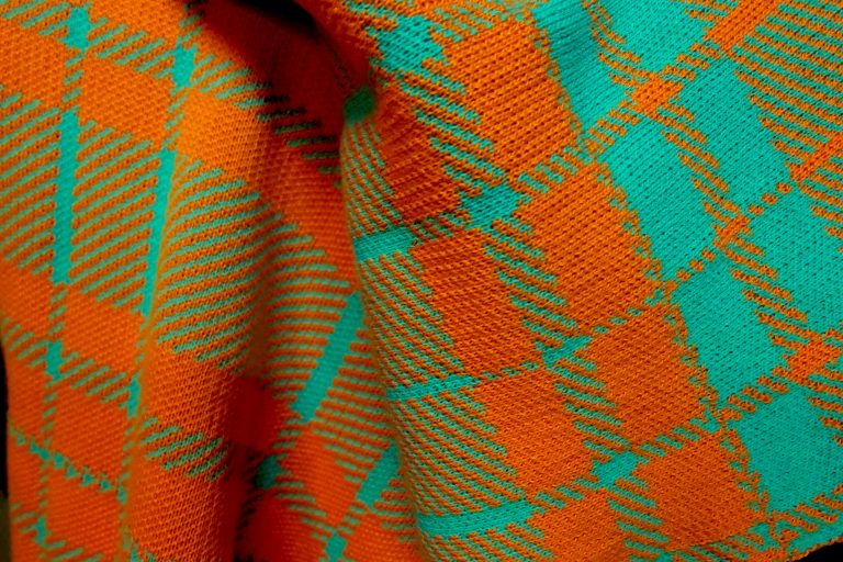 “Woolpunks” est un tissu tricoté qui forme le motif Tartan. Il s’agit de lignes horizontales et verticales entrecroisées et de multiples couleurs. Chez les peuples celtes, le tartan servait de signe de distinction et d’appartenance. Pour ce projet, Audrey détourne les codes graphiques de ce motif celte pour cacher un message.