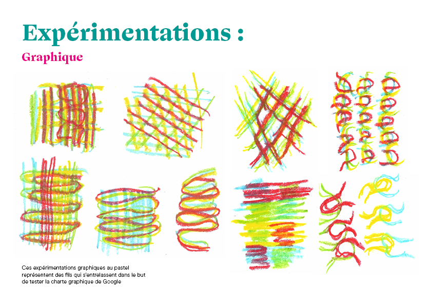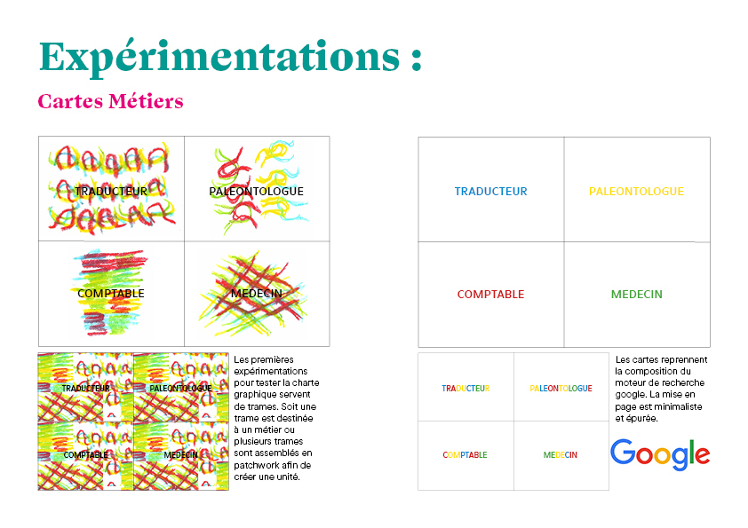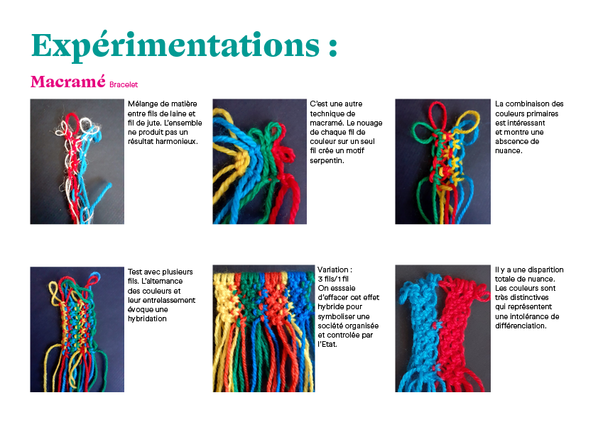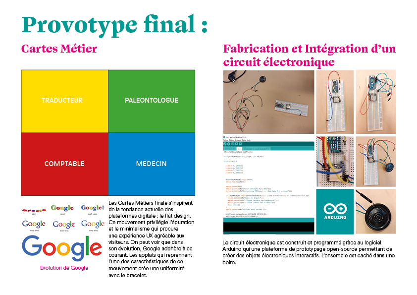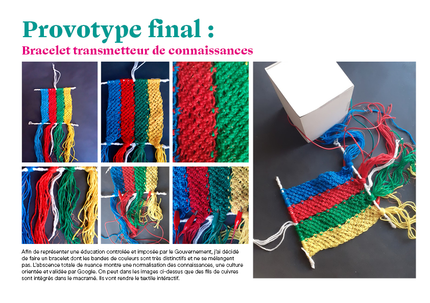 Par rapport au travail de Marion Voillot sur le textile numérique et sonore, j’ai choisi de développer la deuxième proposition : un bracelet transmetteur de connaissances qui s’y prête bien à ce concept. Le Normographe ne permet pas de recueillir de contribution par rapport à un scénario dystopique puisqu’il est plutôt utopique. Au lieu de supprimer les gestes motrices de l’enfant, il le développe. Le bracelet correspond mieux à mon scénario final. C’est un accessoire transportable qui peut faire référence à un signe d’appartenance par conséquent de contrôle. Pour sa fabrication, j’ai opté pour le macramé. L’objet sera accompagné de “Cartes Métier” qui permettront d’imposer un métier à chaque enfant. L’ensemble du dispositif reprend la charte graphique de Google qui est le créateur de cet objet dans le scénario dystopique.
