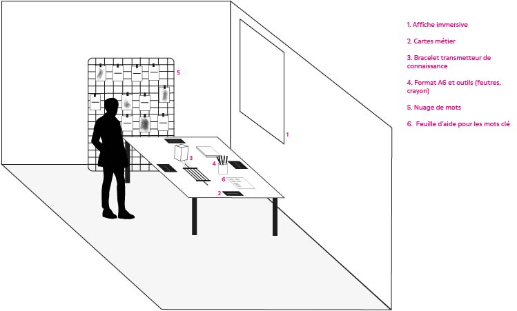 L’atelier commence par la présentation du scénario en s’appuyant sur l’affiche immersive qui propulse les premières années dans un avenir où l’Education Nationale est dirigée par Google. Ensuite, des cartes “métiers” sont imposées à chacune d’elles sans demander leur avis afin de les brusquer. L’étape suivante est le test du provotype. A tour de rôle, les étudiantes essaient le bracelet et appuient sur la couleur qui correspond à celle de sa carte. Un processus de téléchargement se déclenche par un son qui vient d’un circuit électronique intégré au provotype. Chaque couleur est liée à des savoirs qui doivent être assimilés en vue d’accomplir le métier imposé. Enfin, elle devait écrire des mots et les illustrer sur des formats papiers à l’aide d’outils qui expriment leur sentiments, leur sensations, leur ressenti vis-à-vis de cette expérience et les justifient à l’oral. Une liste de mots clés est mise à leur disposition pour les aider.