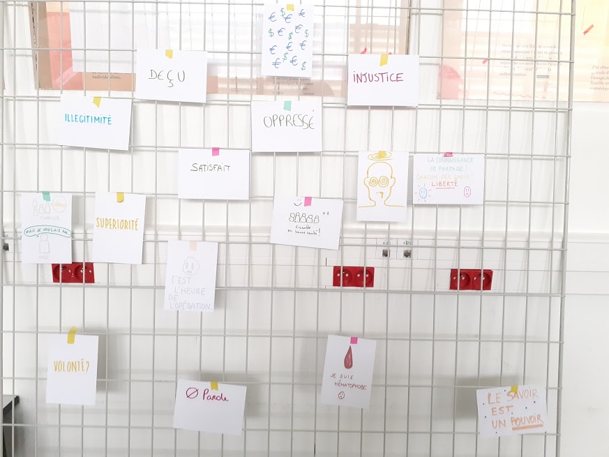 Après le test du bracelet, les étudiants sont invités à faire part de leur ressenti par rapport à cette expérience. Afin de récolter ces réactions, il y a un dispositif d’enregistrement. Il se prénomme le “nuage de mots”. Le principe est d’écrire sur le recto un mot sur un format papier A6 et l’illustrer avec des outils sur le verso. Les mots sont des sentiments, des sensations ou des impressions vis-à-vis du test des provotypes. Chaque format est accroché sur une grille. Puis, ils devront être justifiés à l’oral afin de libérer la parole et d’exprimer ce que les étudiants ont ressenti. Cet échange est enregistré par un enregistreur vocal.