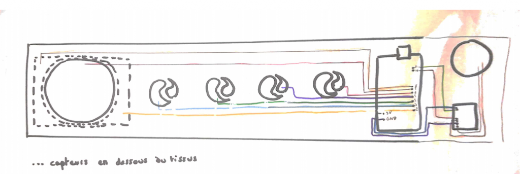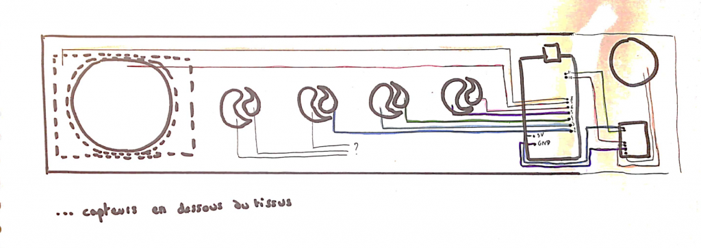 C’est pourquoi, le dispositif, (donc le provotype) serait une espèce de collier ou une laisse où il y aurait cinq zones : une zone avec le capteur du chakra de la gorge qui enregistrerait les sons. En appuyant dessus, on saurait comment on est classé. Ensuite il y aurait quatre autres zones qui correspondraient à une émotion chacune avec à chaque fois deux capteurs et qui permettraient donc deux nuances par émotion.