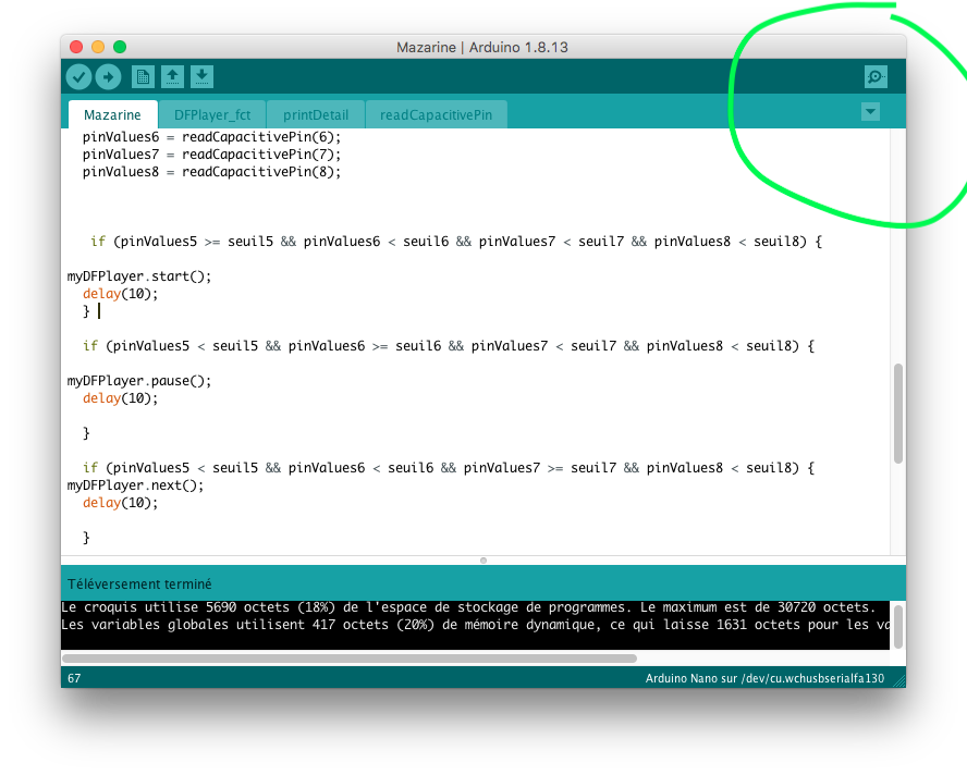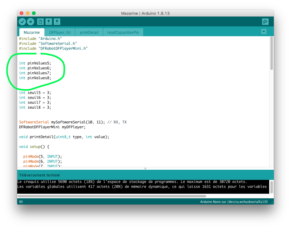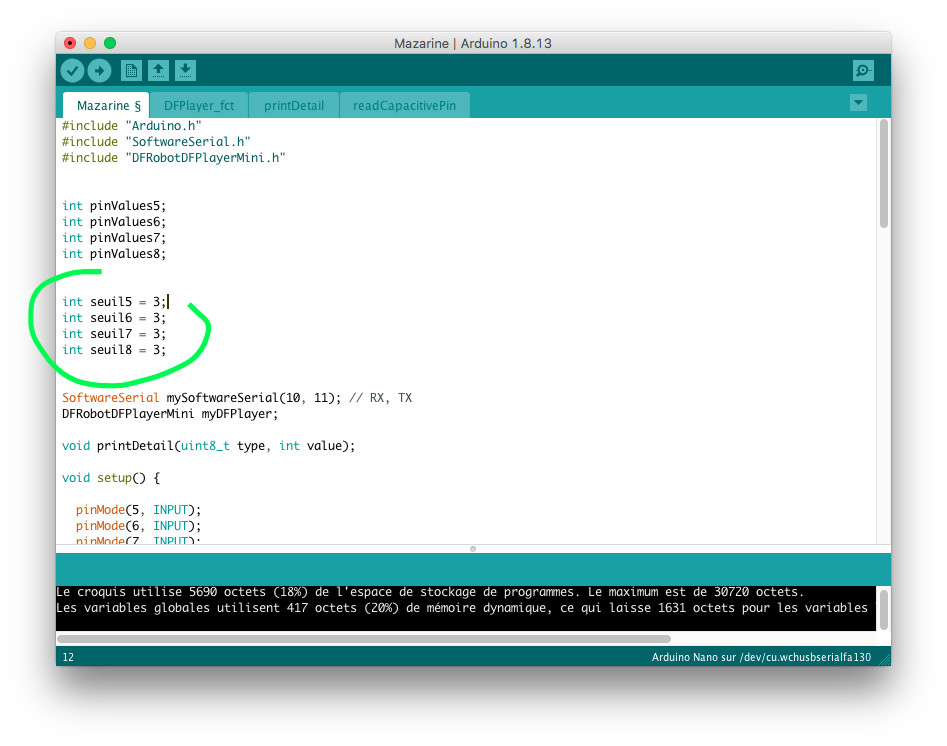 Cela signifie qu’il faut mettre votre seuil plus haut, pour la ou les pins concernées. Par exemple, si au repos elle est à 5, et quand vous touchez la pin elle passe à 10, remplacez votre seuil par 8.
