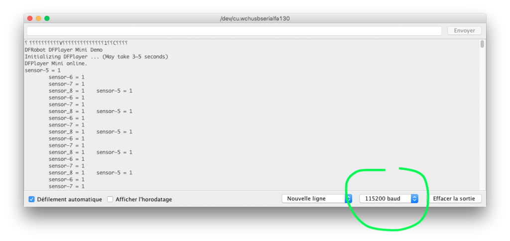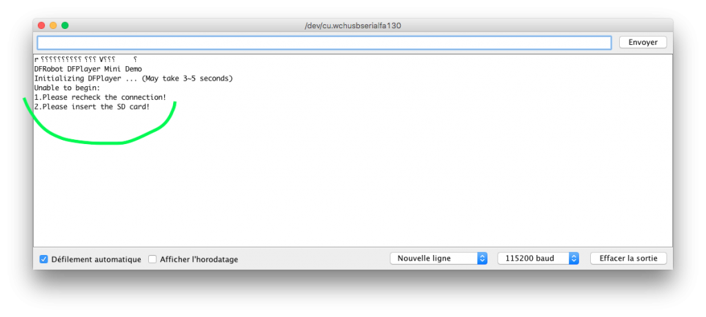 Le moniteur va afficher si le lecteur MP3 (DFPlayerMini) a été détecté.