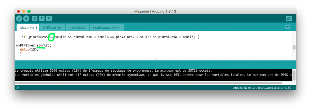 Si les valeurs de la pin 5 sont supérieures ou égales (>=) à leur seuil, et que les pins 6, 7 et 8 sont sont inférieures à leur seuil (<), alors le MP3 DFPlayer commence (start).
