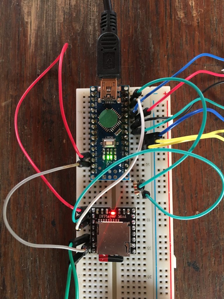 - Déplacer votre haut-parleur, débranchez-le du MP3, et connectez le à la carte Arduino : un cable à D9, et l’autre à GND.